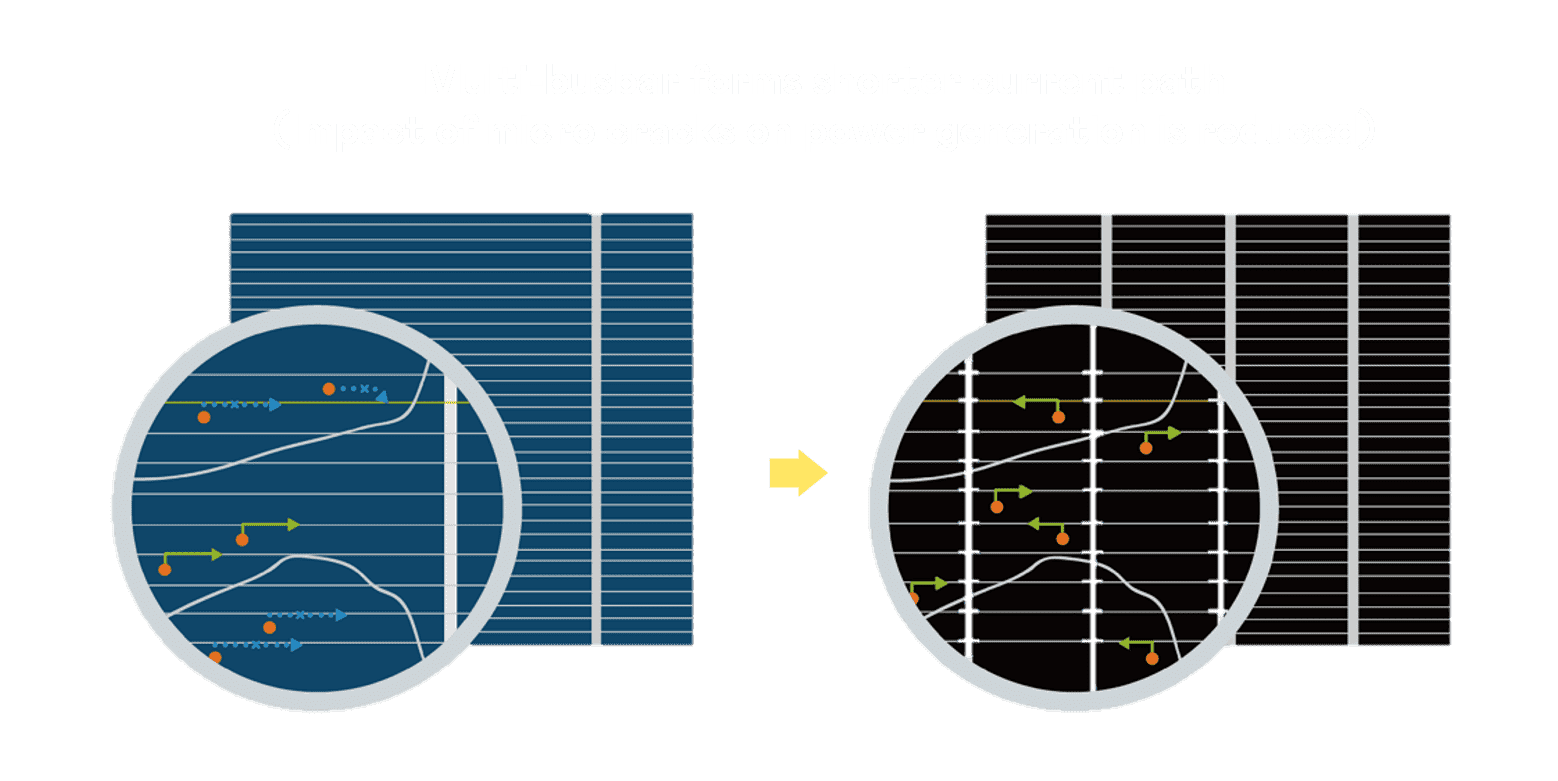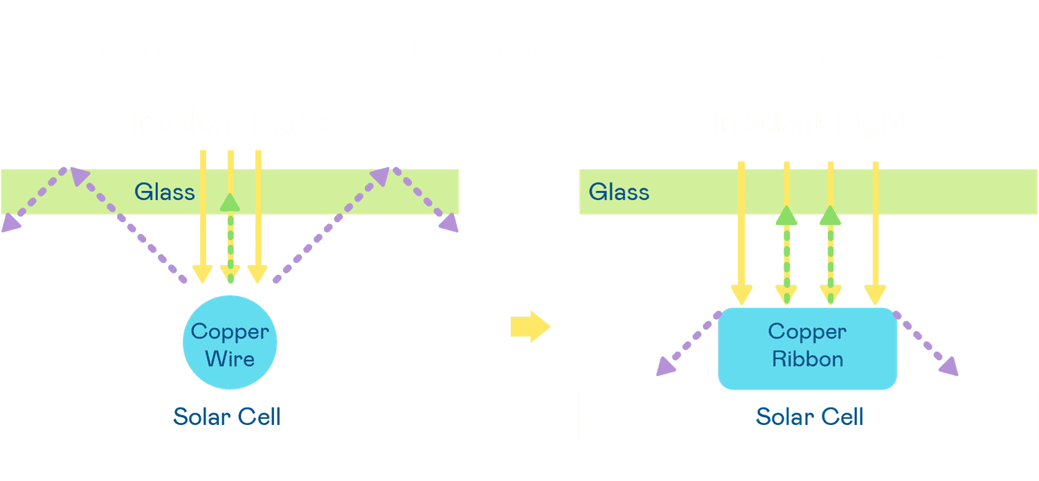 • 电池使用多条铜导线 (Copper wire) 于电池片上形成较短的电流路径,,,提高电流收集效率,,,采用圆形设计的铜导线较传统扁平式的铜焊带 (Ribbon),,可增加入射至电池的光线量。。。。