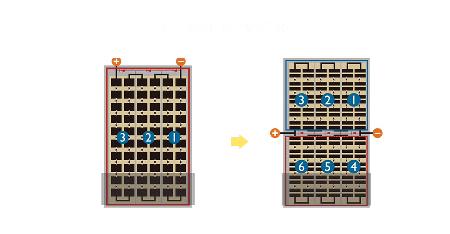 • 结合半切电池,,降低遮阴影响、、、提升模组抗隐裂能力、、、并减少电阻损耗,,进一步提升模组发电效能。。。