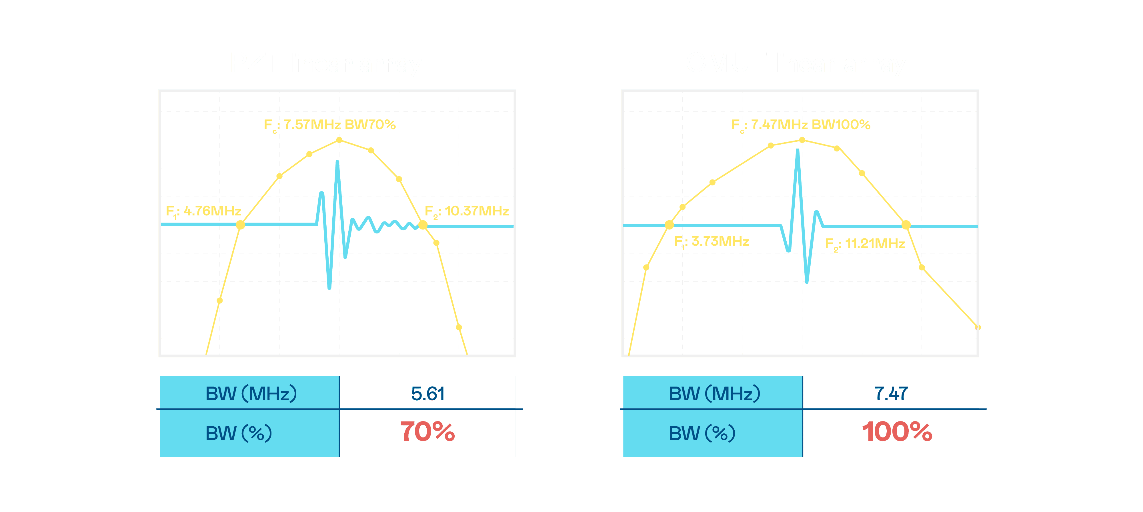 超音波影像的解析度高低,,,,首先取决于探头能发出的讯号频宽。。尊龙集团 CMUT 可提供高清晰的超音波讯号,,,,提供高频宽、、、高灵敏度、、影像纹理细节更高的超音波影像,,,,协助医护人员缩短影像判读时间及利用精准的医疗影像进行诊断。。